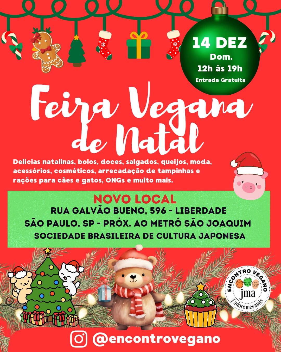 Dezembro chega com o clima do Natal por toda a cidade. É nessa época que as pessoas buscam por opções para a ceia de Natal e Ano-Novo, além de produtos para a decoração e dos tradicionais presentes para os familiares e amigos secretos. A proposta da Feira Vegana de Natal JMA é oferecer uma reflexão sobre como manter as tradições desta época do ano com mais conscientização ambiental e, principalmente, respeito aos direitos dos animais à vida. Para isso, promove dois eventos, no dia 14 de dezembro (no domingo), na Liberdade, e no dia 21 de dezembro (domingo), na Vila Mariana, das 12h às 19h, com entrada gratuita.